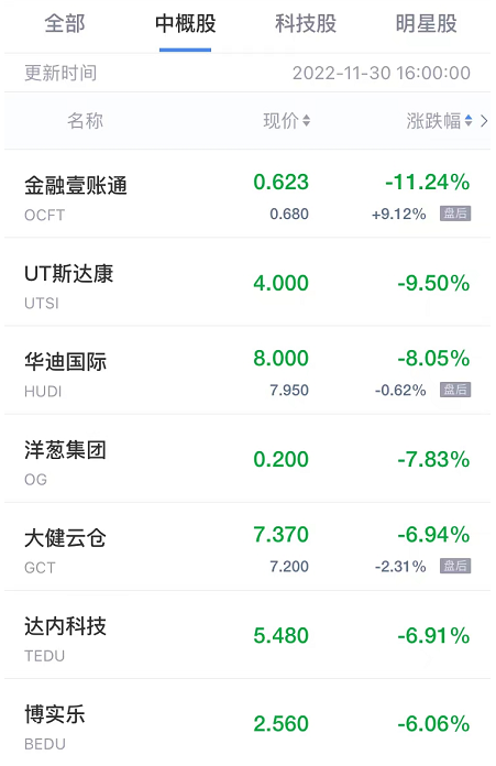 金融壹账通跌超11%,洋葱集团跌超7%,库客音乐、每日优鲜跌超4%,房多多跌超3%,九洲大药房跌超1%。
