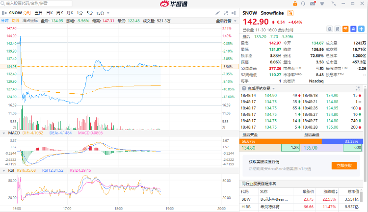 股价方面,Snowflake股价自今年以来下跌大约58%,而同期标普500指数下跌约14%。在周三美股盘后交易中,Snowflake股价一度下挫逾14%,现跌5.39%。