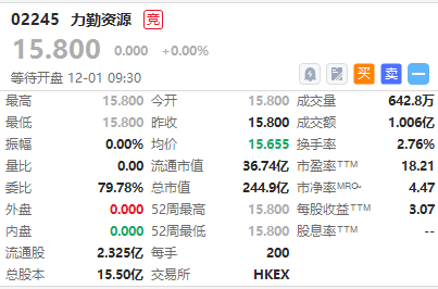 华盛资讯12月1日讯,镍矿龙头企业力勤资源 $02245.HK 首挂平开,盘前成交额超1亿港元,最新总市值超244亿港元,昨日暗盘收跌1.90%。