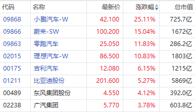 12月1日讯,港股新能源汽车股大幅高开,截至发稿,小鹏汽车绩后涨超25%,蔚来涨近15%,理想汽车涨超10%,吉利汽车涨超6%,比亚迪股份涨超5%。
