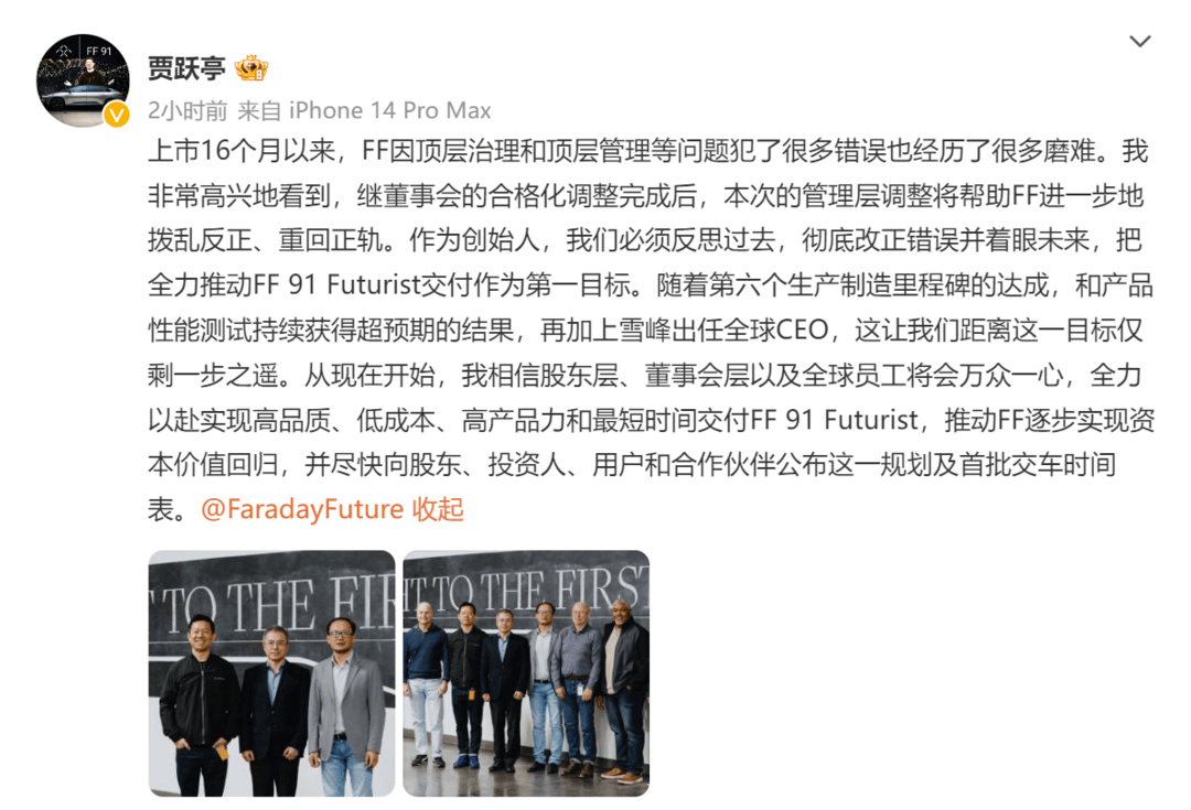 11月30日,贾跃亭微博发文称,作为创始人,将反思过去,彻底改正错误并着眼未来,把全力推动FF 91 Futurist交付作为第一目标。同时表示当前距离FF 91 Futurist交付仅一步之遥,从现在开始,所有员工万众一心,全力以赴实现高品质、低成本、高产品力和最短时间交付FF 91 Futurist。