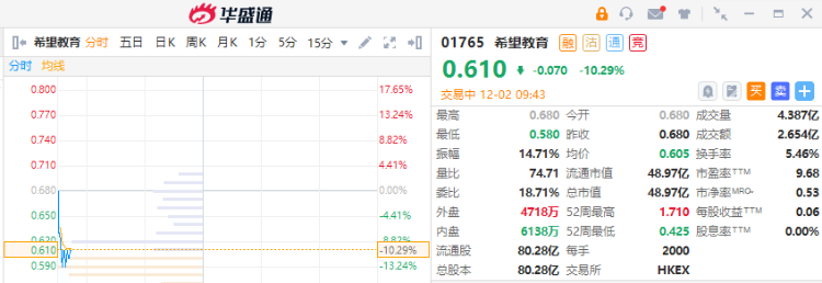 12月2日讯,希望教育(01765)年度经调整纯利减少12.4%,股价低开现跌10.29%,现报0.61港元,成交额超2.6亿港元。