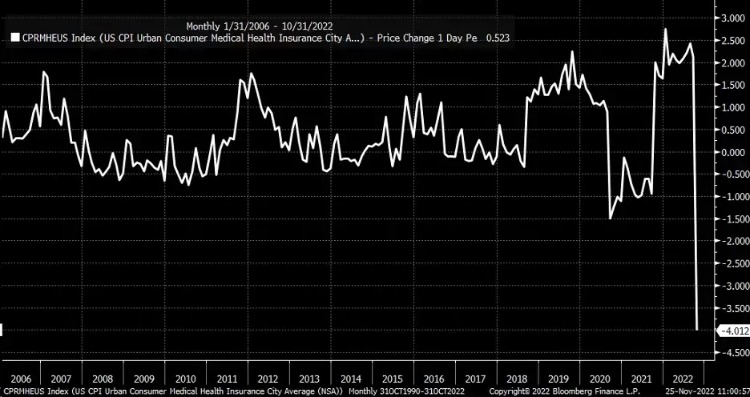 他进一步解释道:10月份的CPI报告显示,医疗保险费用环比下降超过4%,这是自2006年有记录以来的最大降幅。医疗保险成本的下降对总体CPI和核心CPI产生了负面影响,导致这两个数据都低于预期。注:医疗保险在CPI总指数中占近1%的权重