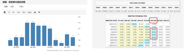 虽然美国经济数据是下来了,但是美联储阶段性仍难松口。11月1年期通胀预期有所回落,跌至4.9%,总体仍在高位。CME加息预期基本上保持不变,明年9月份开始降息,即使11月FOMC会议纪要,透露出加息放缓的信号,但从加息终点来看,加息放缓并未改变加息的终点利率预计,市场对于美联储松口的“预期不高”。现在美股到了一个节点,很难暴跌,因为加息已近尾声,但是要大涨需要看到实质性的宽松和业绩超预期,短期内二者都看不到,所以美股阶段性还是会处在左右为难的情况。