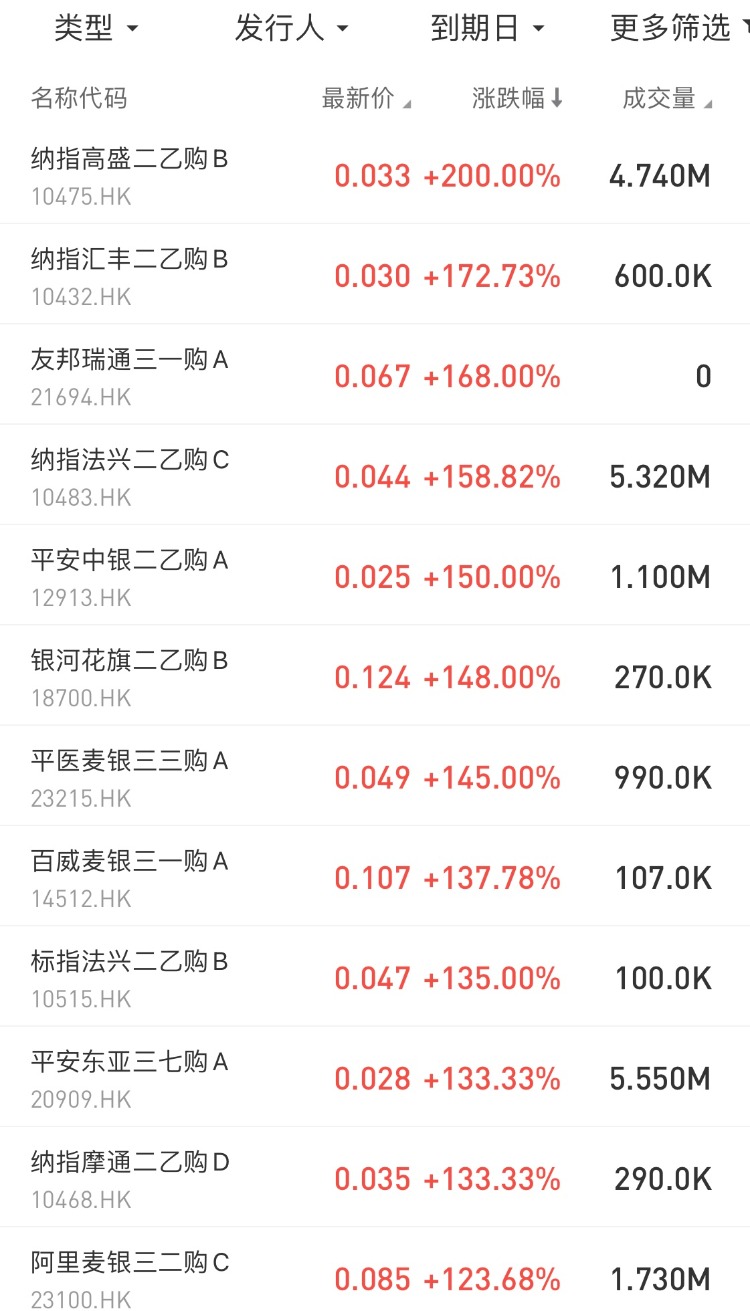 在今日涨幅榜中,纳指高盛二乙购B $10475.HK 涨200%,平安中银二乙购A $12913.HK 涨150%,百威麦银三一购A $14512.HK 涨137.78%。