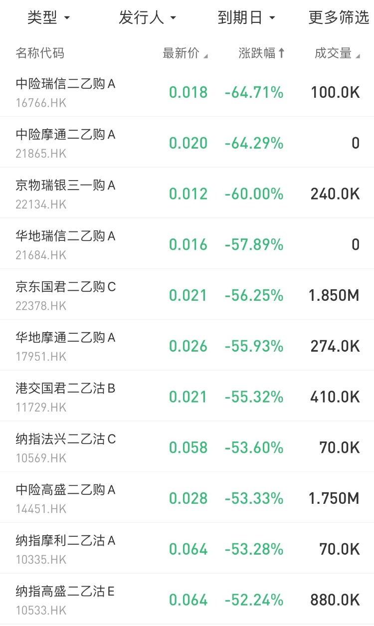 在今日跌幅榜中,中险瑞信二乙购A $16766.HK 跌64.71%,京物瑞银三一购A $22134.HK 跌60%。