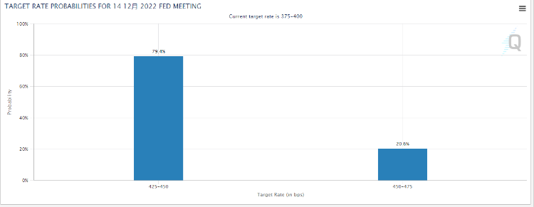 根据CME利率观测工具显示,目前美联储下次加息50个基点的概率为79%,加息75个基点的概率为20.6%。