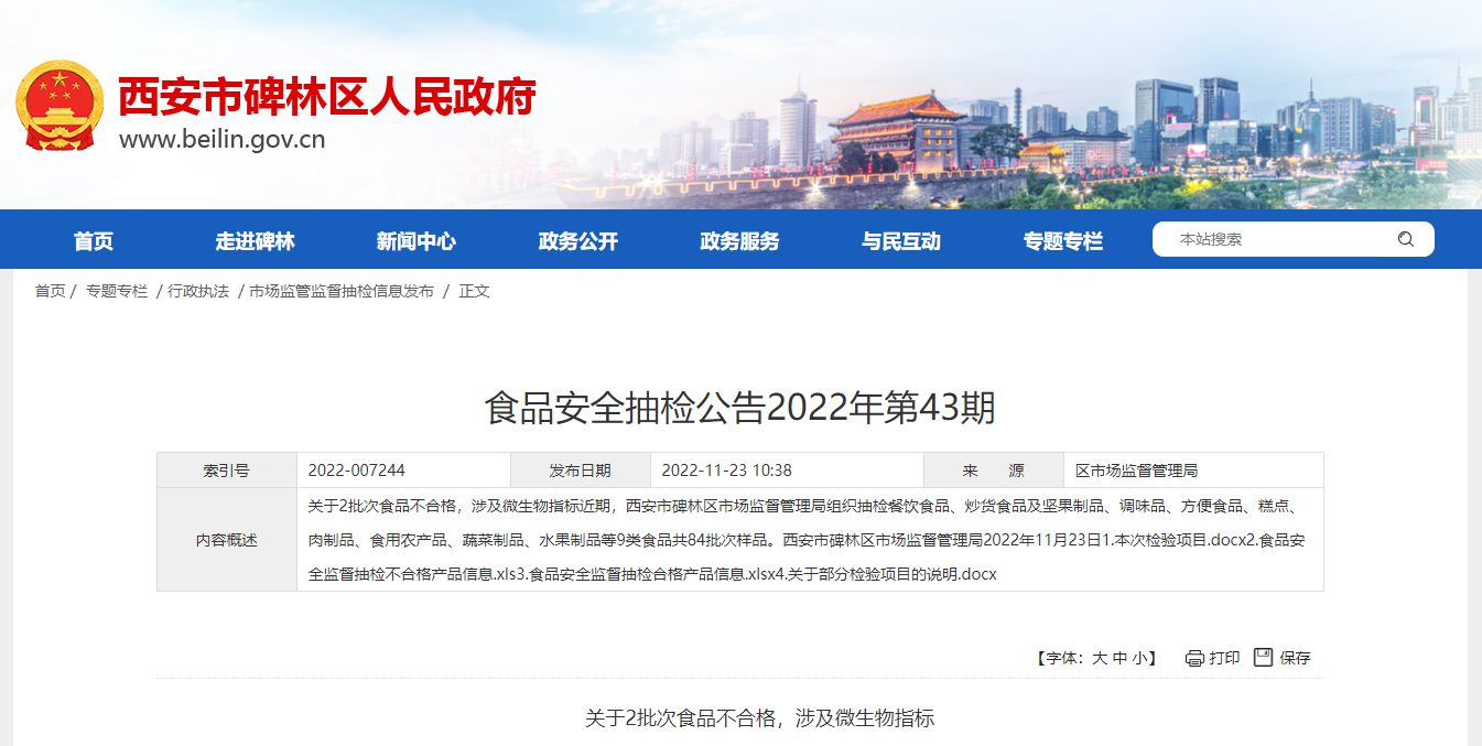 中国质量新闻网讯 日前,西安市碑林区市场监督管理局发布2022年第43期食品安全抽检公告。本期抽检餐饮食品、炒货食品及坚果制品、调味品、方便食品、糕点、肉制品、食用农产品、蔬菜制品、水果制品等9类食品共84批次样品。根据食品安全国家标准检验和判定,其中抽样检验项目合格样品82批次,不合格2批次。