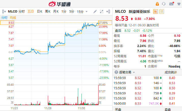 1、利好提振,新濠博亚娱乐 $MLCO 本周内累涨超29%,11月累计涨幅达55.94%,日内港股濠赌股板块全线走强;