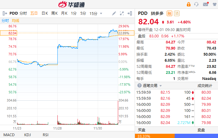 巴克莱:拼多多目标价从70美元上调至84美元,维持“增持”评级