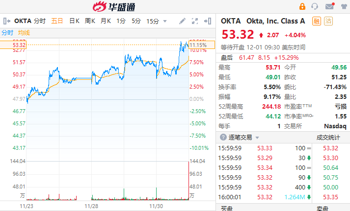 - 基于云的身份验证公司Okta周三盘后飙升15%,截至发稿,盘前涨超13%,本周前三个交易日累涨超6%(不计盘后涨幅)。该公司在周三盘后公布了最新2023财年Q3财报,报告期内,公司实现营收4.81亿美元,前值为3.507亿美元,预期值为4.653亿美元,超出市场预期3.37%。在Non-GAAP准则下,该公司净亏损为100万美元,去年同期则为1100万美元,同比收窄。