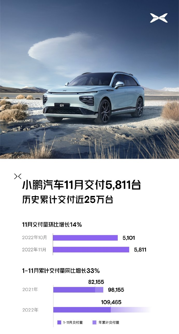 12月1日,小鹏汽车公告,11月总交付5811台,环比增长14%,其中,小鹏G9交付1,546台,环比增长148%。历史总交付量接近25万台。11月30日,小鹏汽车发布第四季度交付指引为2万-2.1万台,预示12月交付量有望大幅回升,重回万台水平。