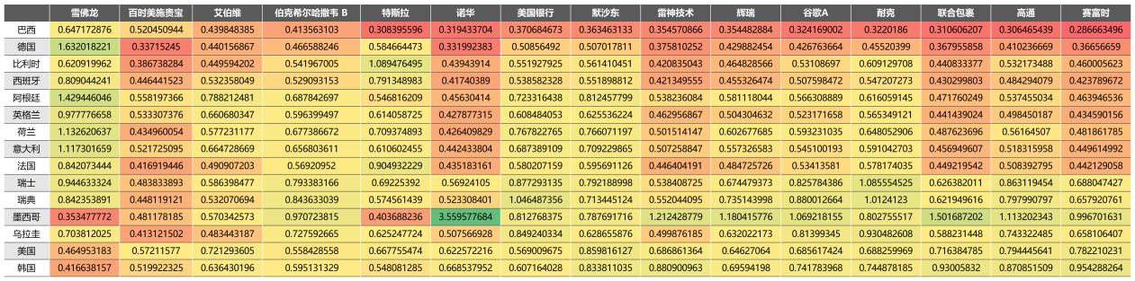 以此类推,同单场平均失球数统计防回撤能力指标,用参与历届世界杯最终排名的方差作为稳定性指标,用单场净胜球数作为历史回测指标,同类标的表现则用所属大洲在世界杯的总体表现衡量。