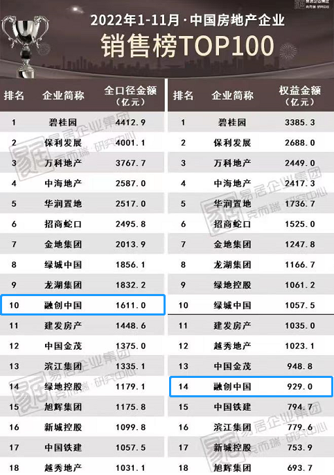 据克而瑞监测披露,今年前11个月,融创全口径销售额1611亿元,排名第10位,对应权益销售额929亿元,排名第14位。