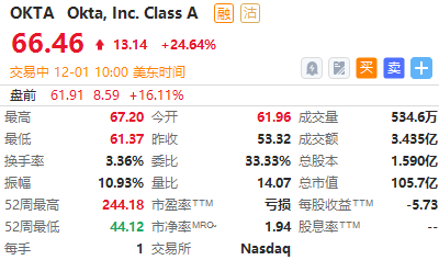 Okta $OKTA 涨超24%,第三季度营收4.81亿美元,超预期,公司预计第四季度营收4.88-4.9亿美元,预期为4.887亿美元。