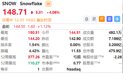 Snowflake $SNOW 涨超4%,总营收5.57亿美元,高于市场预期的5.4亿美元,同比增长67%,第三财季经调净利涨至3845万美元。