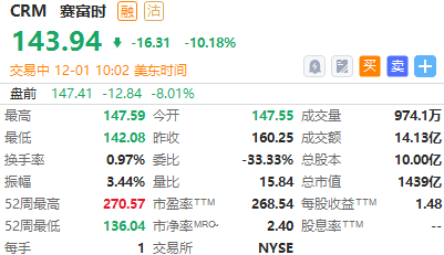赛富时 $CRM 大跌超10%,第三财季营收78.37亿美元略超预期,净利润2.1亿美元,同比下降55%,值得注意的是,赛富时CEO Bret Taylor将离开公司。