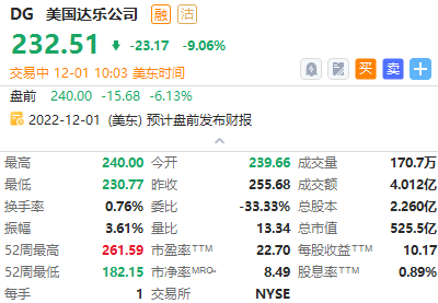 美国达乐公司 $DG 跌超9%,Q3实现营收94.65亿美元,每股收益为2.33美元,比市场预期低7.91%。