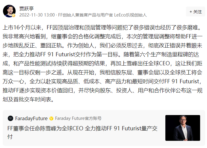 11月30日,贾跃亭在个人社交媒体上对这次人事变更做出了侧面回应,称“我非常高兴地看到,继董事会的合格化调整完成后,本次的管理层调整将帮助FF进一步地拨乱反正、重回正轨。”