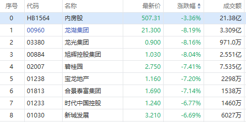 12月2日早间,港股内房及物管板块走低,截至发稿,龙湖集团、旭辉控股集团跌超8%,碧桂园、旭辉永升服务跌超7%,碧桂园服务跌超7%。