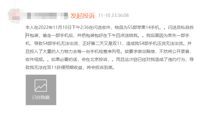 《消费者报道》采访了部分投诉闪送的消费者。杨先生向《消费者报道》表示,自己在11月10日下午通过闪送快递收取多台苹果手机,不料其中一台苹果手机不翼而飞。