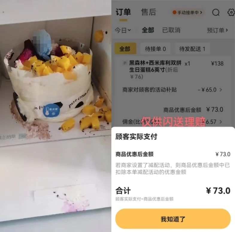 随后,阿峰联系闪送平台处理退款和赔偿事宜。“闪送平台同意退还配送费,不过蛋糕没有按照实际价值赔偿,我还要给顾客赠送礼品并道歉。”阿峰说道。