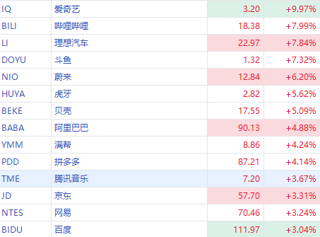 其他热门中概股,爱奇艺涨超9%,哔哩哔哩、斗鱼涨超7%,虎牙、贝壳涨超5%,阿里巴巴、拼多多涨超4%,京东、网易、百度涨超3%。
