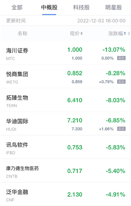 海川证券跌超13%,讯鸟软件跌超5%,亘喜生物、e家快服跌超4%,见知教育跌超3%,51Talk、尚乘数科跌超2%,房多多跌超1%。