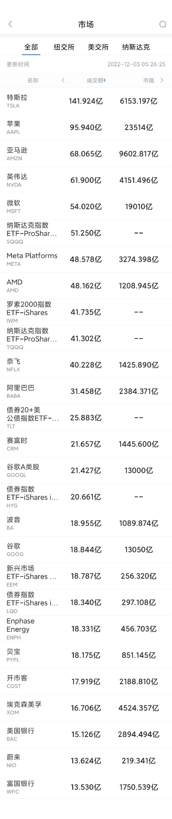 周五美股成交额冠军特斯拉收高0.08%,成交141.9亿美元。特斯拉公司当地时间12月1日交付了首款电动半挂式重卡Semi,这是该车型发布5年来首次实现交付。不过业内关于锂电池电动卡车的商业化前景仍然存在怀疑。