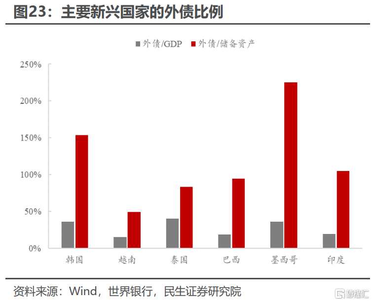 展望未来,“强美元+偏高的能源价格”或为下一场新兴市场危机埋下隐患。随着欧美等发达国家进入衰退,新兴国家的外部需求将明显下降,其出口优势或将逐渐消失。另一方面,全球能源供给问题未得到实质性解决,对于一些依赖能源进口的国家来说,未来很可能遭遇经常项目逆差。同时,在“高利率-高波动”的宏观环境下,全球市场一旦发生流动性危机,新兴市场资产往往被首先抛售。货币贬值叠加利率上行可能会让某些新兴国家的债务难以持续。在主要的新兴国家中,韩国与墨西哥的外债规模明显偏高,其债务风险需要保持关注。