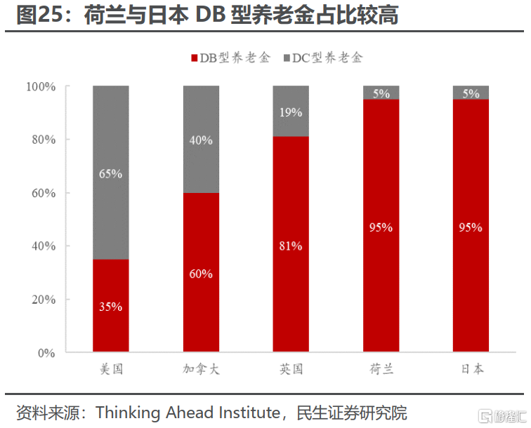 从养老金结构看,荷兰与日本的风险值得关注。通常来说,DB型养老金对冲负债端利率风险的需求更大,因此会持有更多的利率衍生品。荷兰和日本DB型养老金占比均达到95%,全球范围内偏高,我们需要关注这两个国家的风险问题。