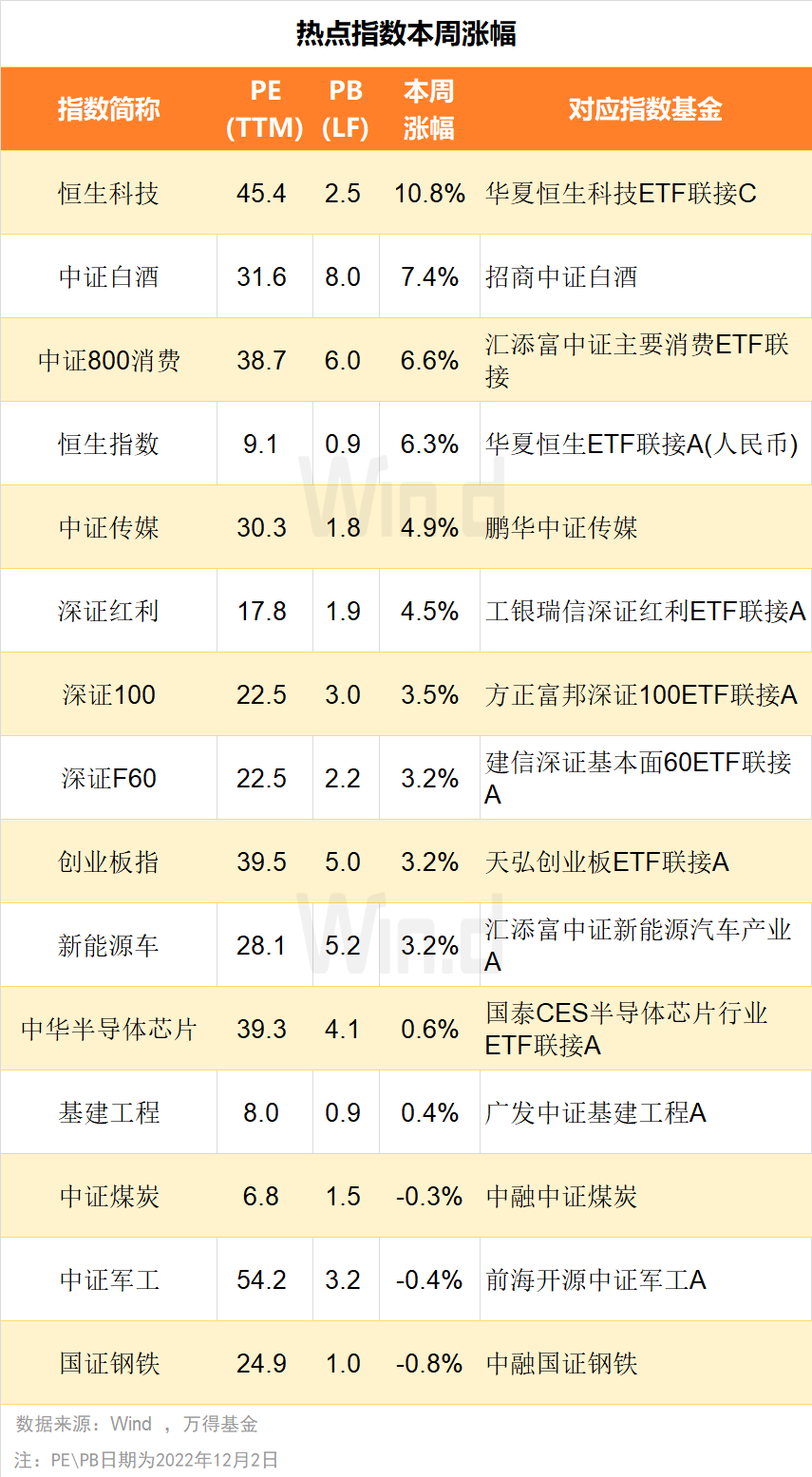 本周热门指数多数上涨,其中恒生科技大幅上扬10.8%,表现最好。