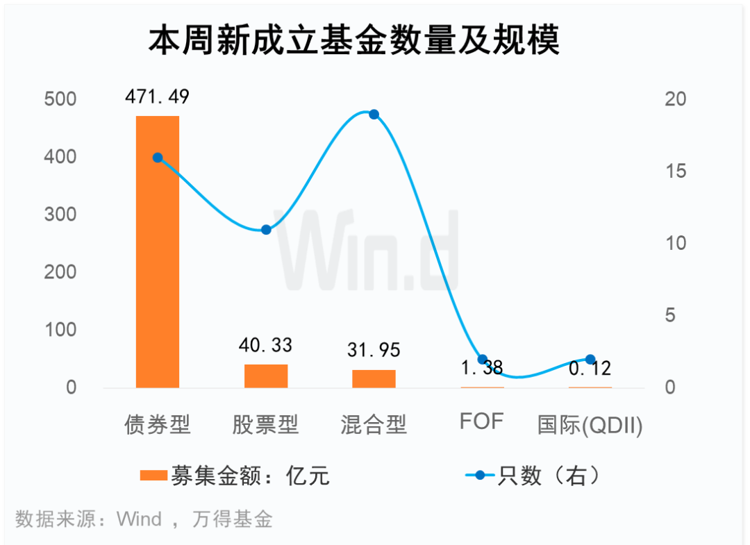 本周合计成立50只基金(ABC类分开统计),合计募集资金545.27亿元。其中,债券型16只,合计募集471.49亿元;股票型11只,合计募集40.33亿元;混合型19只,合计募集31.95亿元;FOF2只,合计募集1.38亿元;国际(QDII)2只,合计募集0.12亿元。