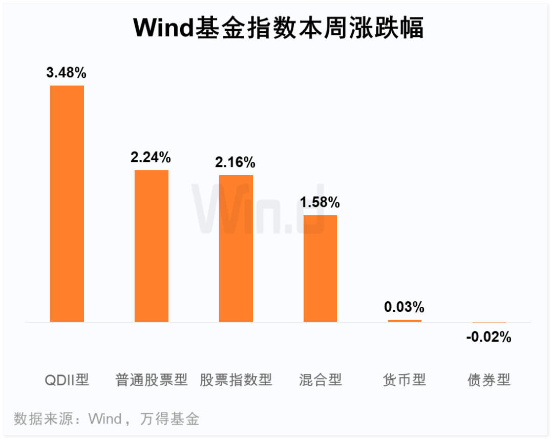 本周基金指数多数飘红,QDII型大涨3.48%,涨幅居首。其中,嘉实全球互联网人民币(000988.OF)明显上扬。