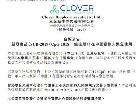 三叶草生物发布公告,集团自愿作出,以知会本公司股东及潜在投资者本集团核心产品的最新开发状况,公司领先的新冠疫苗SCB-2019(CpG 1018╱铝佐剂)已获中华人民共和国(「中国」)有关部门评估并在中国被纳入紧急使用。