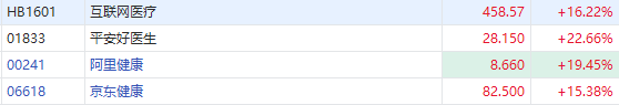 12月5日,在国内防疫政策持续优化的背景下,港股互联网医疗板块持续走高。以平安好医生 $01833.HK 、阿里健康 $00241.HK 、京东健康 $06618.HK 为首的互联网医疗股集体上涨。截至发稿时,股价分别涨超22%、19%、15%。
