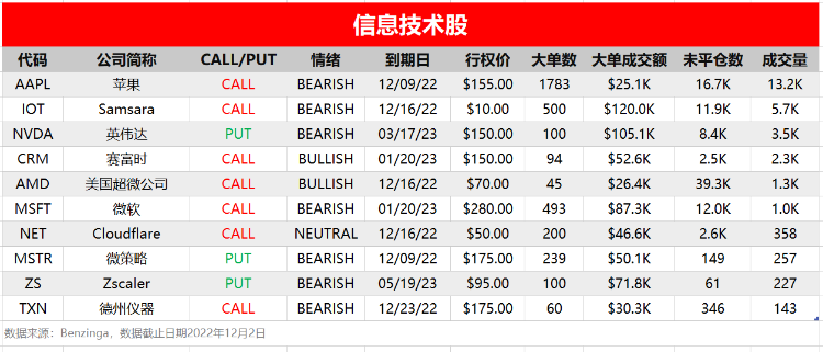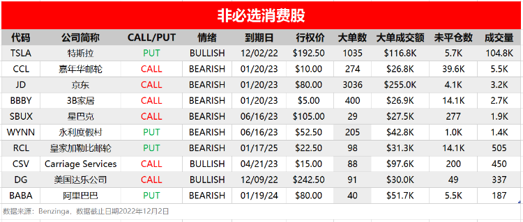 周五(12月2日),非必选消费、信息技术和能源板块相关个股出现较多活跃单,按照当日成交量排行,榜单TOP分别如下:
