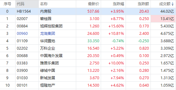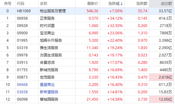 华盛资讯12月5日讯,内房物管股午后持续走高,截至发稿,旭辉永升服务涨22%,旭辉控股集团涨15%,碧桂园服务涨14%,龙湖集团涨10%,碧桂园涨8%。
