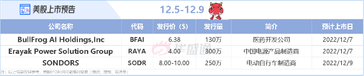 本周IPO市场,截至目前,暂时预计将迎来3只新股挂牌,中国公司雷亚电子和医药开发公司BFAI预计周三登陆美股市场。需要注意的是,美股IPO时间可能随时变更(包括提前、延后等),投资者需持续跟进相关消息。