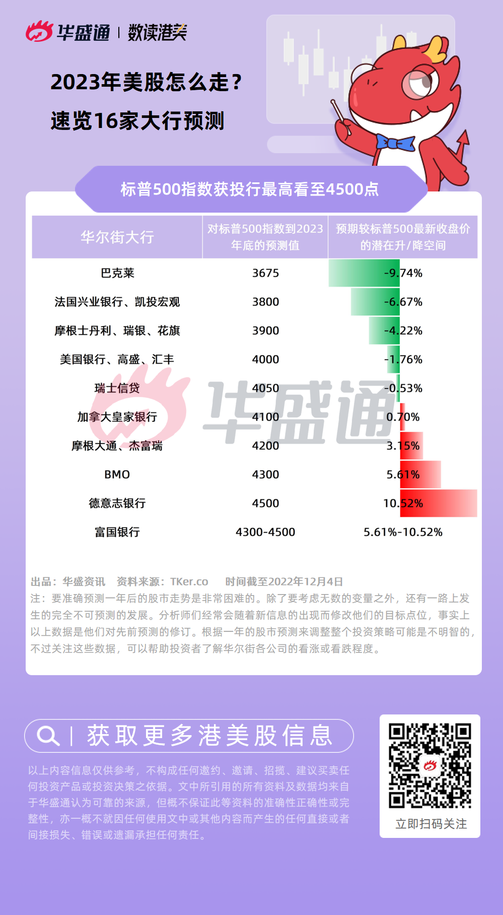 15、德意志银行:预计标普500指数在2023年底时将达到4,500点,预计2023年该指数的每股收益将为195美元。