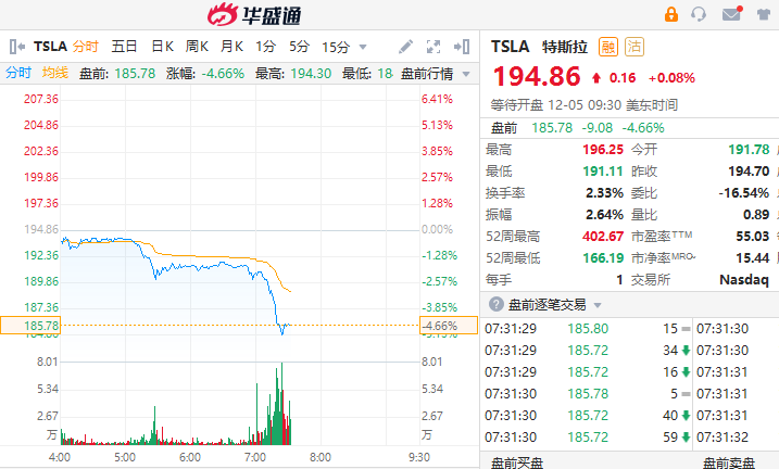 特斯拉 $TSLA 盘前短线跳水,一度跌超5%。截至发稿,该股跌幅收窄,下跌约4.66%报185.78美元。