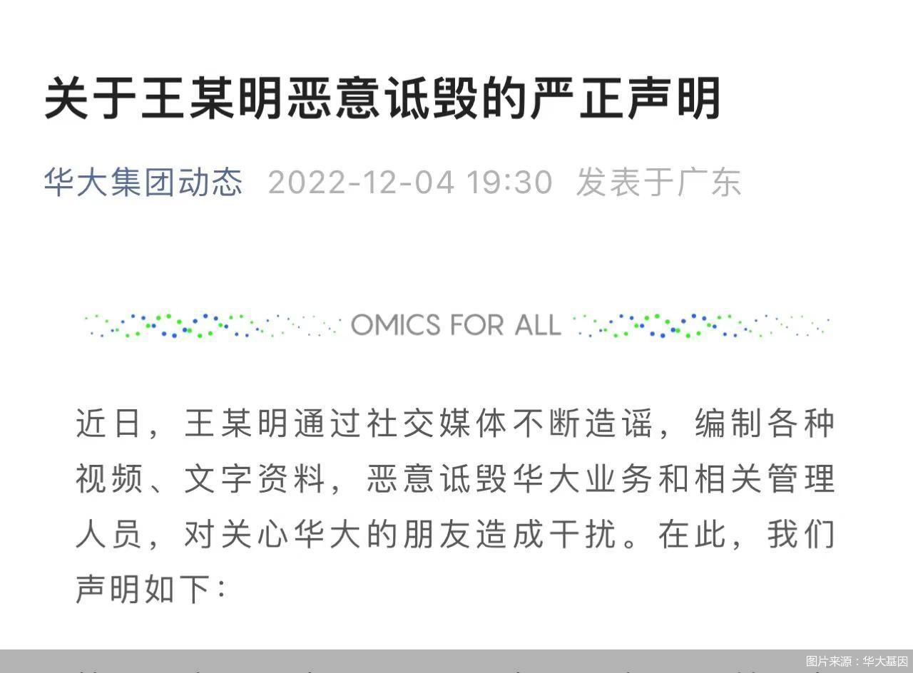 对于举报内容,华大基因方面回应称“造谣”“恶意诋毁”。根据《关于王某明恶意诋毁的严正声明》,自2017年1月至2017年12月间,王某明在与华大合作期间出现多项严重违约行为,华大依法解除与其合作。此后王某明向华大提出高额无理“索赔”,并从2018年开始通过自媒体多次捏造事实诋毁公司,就此,华大已通过司法诉讼进行维权。