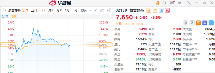 12月6日讯,截至发稿,奈雪的茶早盘一度涨超16%。根据公告,该公司以5.25亿元投资“乐乐茶”品牌运营公司上海茶田餐饮管理有限公司,预计投资完成后持有该公司扩大后股本权益约43.64%。