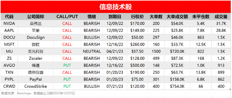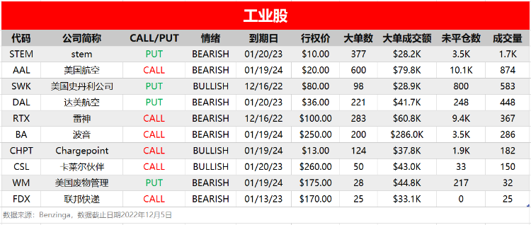 周一(12月5日),非必选消费、信息技术和工业板块相关个股出现较多活跃单,按照当日成交量排行,榜单TOP分别如下: