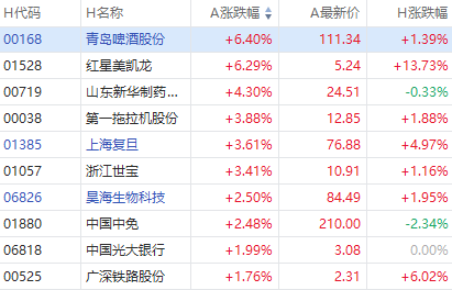 截至发稿,青岛啤酒A股涨超6%,H股涨超1%;红星美凯龙A股涨超6%,H股涨超13%;上海复旦A股涨超3%,港股涨超4%;山东新华制药A股涨超3%,港股微跌。