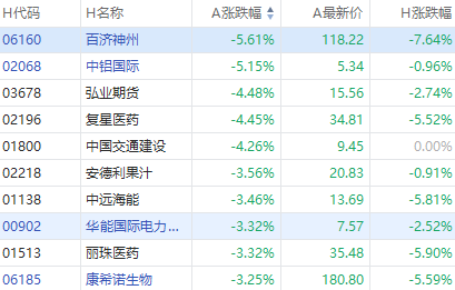 百济神州A股跌超5%,港股跌超7%;中铝国际A股跌超5%,港股跌近1%;复星医药A股跌超4%,港股跌超5%。