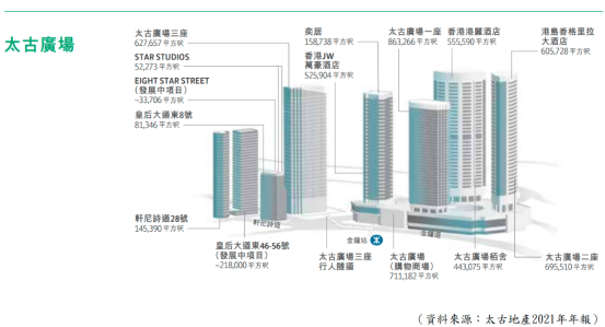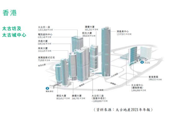商厦物业方面,主要有太古广场、太古坊、港岛东中心等,楼面面积总计逾1000万平方呎,租用率高,情况理想,而这些商厦物业无论在地点以及租金回报方面都是理想的,故太古地产这部分的组合十分优质。