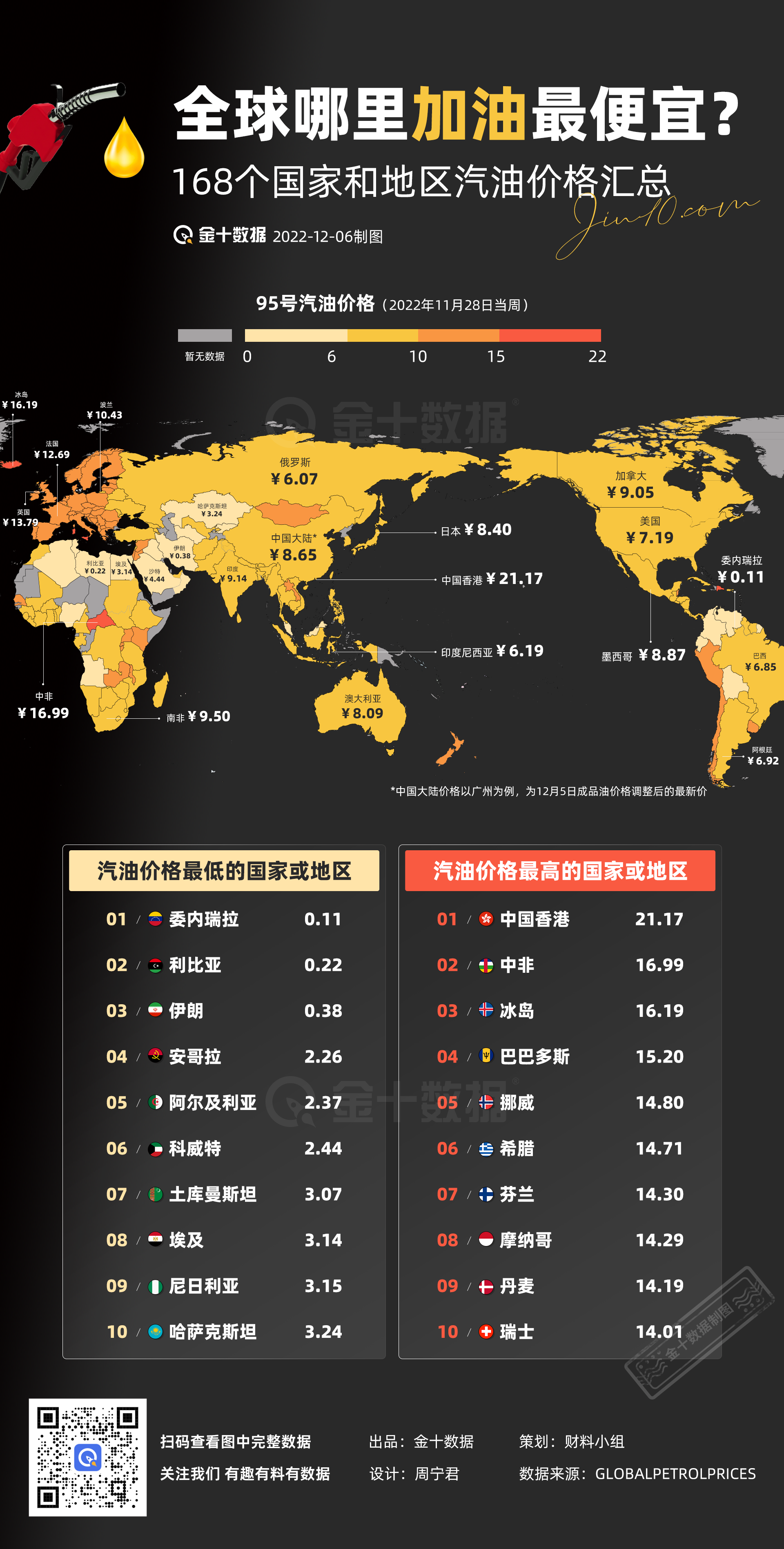 国内成品油价格二连降,12月5日24时起,国内汽油、柴油价格每吨分别降低440元和425元。本轮调整后,以广州市为例,95号汽油价格下降为8.65元/升。这个价格在全球范围来看是个什么水平呢?