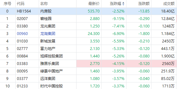 华盛资讯12月7日讯,港股内房股普遍走低,截至发稿,碧桂园跌超9%,龙光集团跌超7%,龙湖集团跌超6%,旭辉控股集团、雅居乐集团跌超4%。