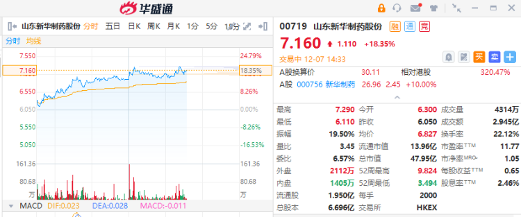 12月7日讯,山东新华制药(00719)今日A股再度涨停,H股现涨超18%,截至发稿,涨18.35%,报7.16港元,成交额2.94亿港元。